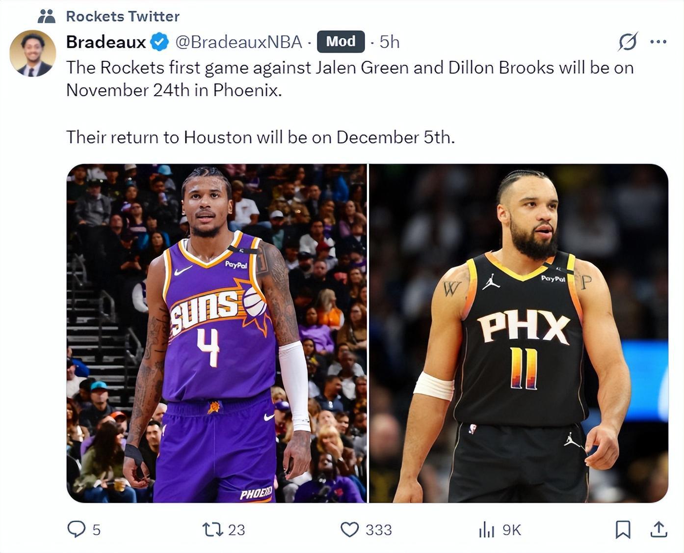 太阳与火箭今夏完成了交易,在11月24日杜兰特将回到菲尼克斯对阵老东家太阳,而杰伦-格林、狄龙将在12月5日返回休斯顿面对老东家,这两场比赛看点都很足。
